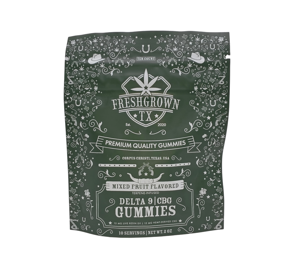 FRESH GROWN TX GUMMIES, LIVE RESIN, DELTA 9, CBG, MIXED FRUIT FLAVORED , 10 COUNT