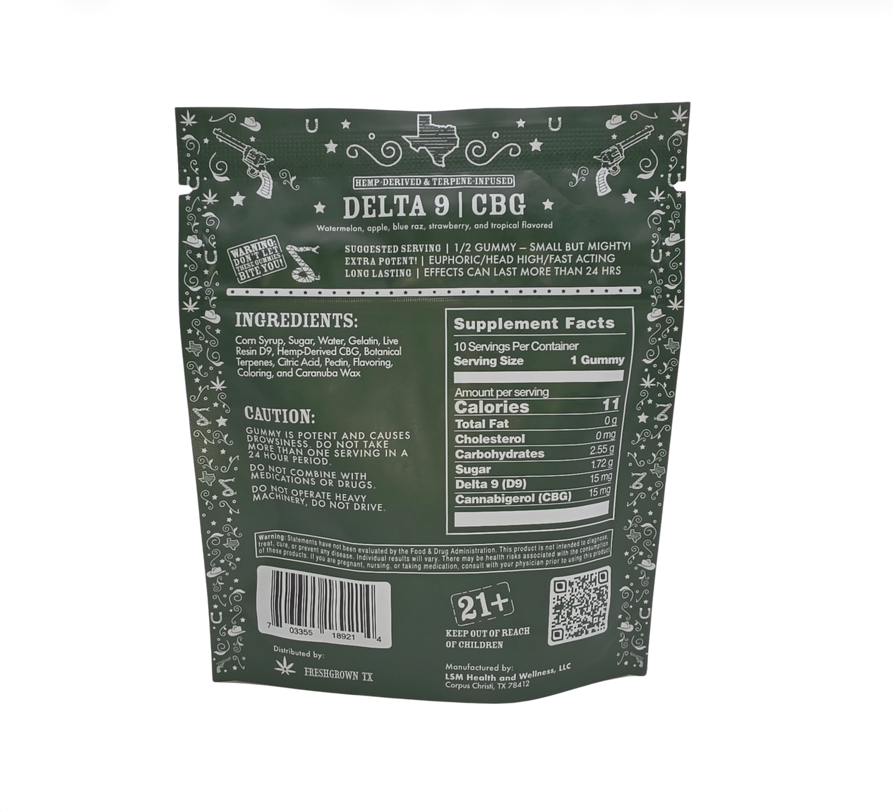 Harness the full-bodied power of Texas-grown hemp with FreshGrown TX’s Live Resin D9 | CBG Gummies — precision-crafted, bold in effect, and rooted in Lone Star quality. Each gummy delivers a potent 15 mg of live-resin delta-9 THC (D9) plus 15 mg of CBG, in a convenient 10-count pouch — giving you a purposeful dose every time.